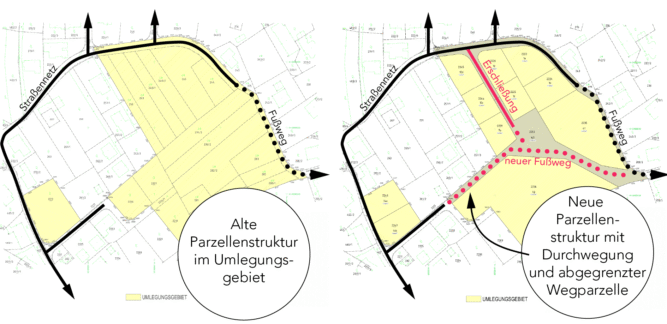 Eine Neuparzellierung ist das Neuziehen von Grundstücksgrenzen. Dieser Schritt kann genutzt werden, um künftige Wegeverbindungen langfristig abzusichern. Die Gemeinde kann Flächen ankaufen und als Verkehrsfläche widmen oder einen Gehweg über ein Wegerecht im Grundbuch sichern. Auch bei einer Umlegung oder Teilung von Grundstücken lohnt es sich, an Fuß- und Radwege zu denken: So können Flächen für Durchwegungen eingeplant und die dafür benötigte Fläche anteilig auf mehrere Eigentümer:innen verteilt werden.